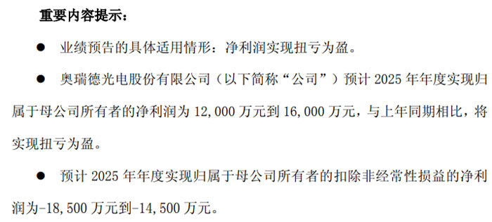 2026 年 1 月 26 日,奧瑞德光電股份有限公司(證券代碼:600666,證券簡稱:奧瑞德)發(fā)布 2025 年年度業(yè)績預盈公告(公告編號:臨 2026-005)。經公司財務部門初步測算,預計 2025 年年度實現(xiàn)歸屬于母公司所有者的凈利潤為 12,000 萬元到 16,000 萬元,與上年同期相比實現(xiàn)扭虧為盈;預計同期歸屬于母公司所有者的扣除非經常性損益的凈利潤為 - 18,500 萬元到 - 14,500 萬元。需要注意的是,本次業(yè)績預告數(shù)據未經注冊會計師審計。