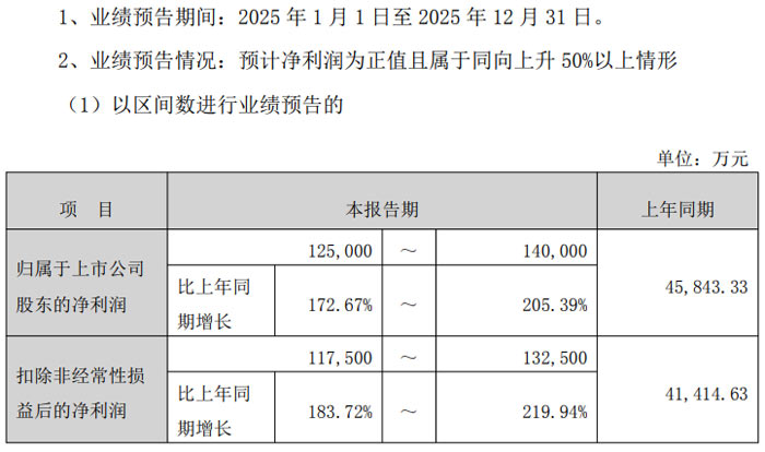 長川科技歸屬于上市公司股東的凈利潤預計為 125,000 萬元至 140,000 萬元,上年同期該數(shù)據(jù)為 45,843.33 萬元,同比增長幅度達 172.67% 至 205.39%;扣除非經(jīng)常性損益后的凈利潤預計為 117,500 萬元至 132,500 萬元,較上年同期的 41,414.63 萬元同比增長 183.72% 至 219.94%。