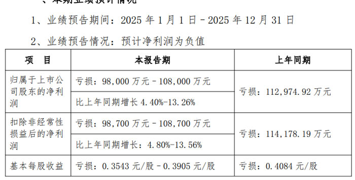 公司歸屬于上市公司股東的凈利潤預(yù)計虧損 98,000 萬元至 108,000 萬元,上年同期虧損 112,974.92 萬元,同比增長 4.40%-13.26%;扣除非經(jīng)常性損益后的凈利潤預(yù)計虧損 98,700 萬元至 108,700 萬元,上年同期虧損 114,178.19 萬元,同比增長 4.80%-13.56%;基本每股收益預(yù)計虧損 0.3543 元 / 股至 0.3905 元 / 股,上年同期虧損 0.4084 元 / 股。