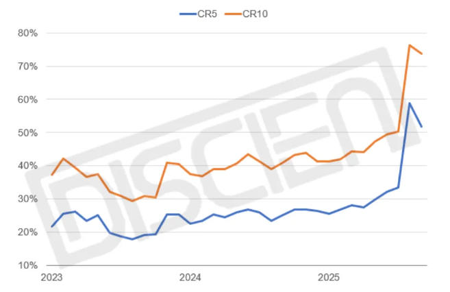 500元以下入門款的銷售下滑也讓1LCD在2025年的價格帶上移表現(xiàn)較為明顯,均價從806元增至871元,同時品牌集中度顯著提高,CR5由2024年的37%增至2025年的51%。
