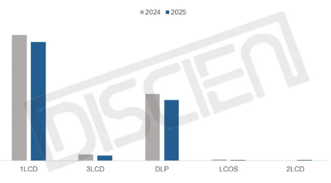 顯示技術(shù)方面,1LCD仍占據(jù)市場主導(dǎo),2025年銷量達(dá)348萬臺,占比64.3%。DLP盡管同時面臨市場衰退和大尺寸TV等競品降價的雙重壓力,受益于今年以來的價格下沉政策與國補帶來的支撐,份額僅微跌至33.9%。3LCD份額繼續(xù)萎縮,從3.2%跌至2.7%。LCOS仍屬小眾,份額占比僅0.6%,其商業(yè)化進(jìn)程尚待突破。
