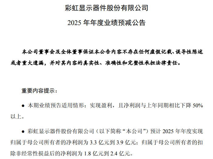 1 月 30 日,彩虹顯示器件股份有限公司(證券代碼:600707,證券簡稱:彩虹股份)發(fā)布 2025 年年度業(yè)績預(yù)減公告。預(yù)計(jì)公司 2025 年年度實(shí)現(xiàn)歸屬于母公司所有者的凈利潤為 3.3 億元至 3.9 億元,與上年同期相比,將減少 8.5 億元至 9.1 億元,同比減少 68.55% 至 73.39%;歸屬于母公司所有者的扣除非經(jīng)常性損益后的凈利潤為 1.8 億元至 2.4 億元,較上年同期減少 7.97 億元至 8.57 億元,同比降幅達(dá) 76.86% 至 82.64%。