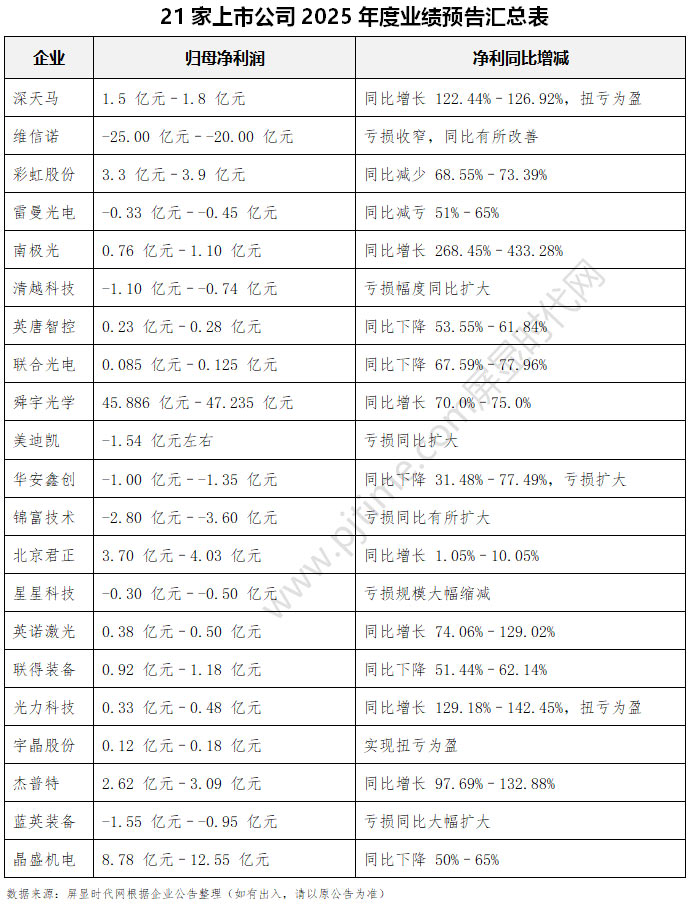 深天馬、維信諾、彩虹股份、雷曼光電、南極光、英唐智控、舜宇光學(xué)等21企2025年業(yè)績預(yù)告出爐