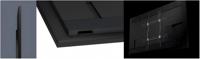 左:纖薄的機(jī)身設(shè)計(jì);中:底部的內(nèi)凹式提手;右:位于中心的VESA安裝孔
