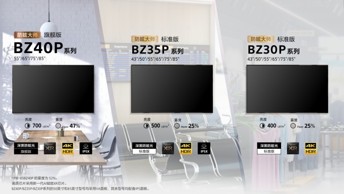 BZ40P系列(旗艦線):共四款產(chǎn)品,尺寸覆蓋55英寸到85英寸,配備旗艦版深黑防眩光涂層,可提供47%*1霧度和低反射性能,同時(shí)具備700 cd/m²(典型)亮度和IP5X防塵等級。