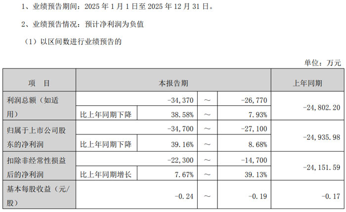 歸屬于上市公司股東的凈利潤預(yù)計為 - 34,700 萬元至 - 27,100 萬元,上年同期為 - 24,935.98 萬元,同比下降 8.68% 至 39.16%;