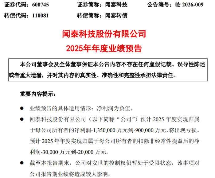 近日,聞泰科技股份有限公司(證券代碼:600745,證券簡(jiǎn)稱:聞泰科技;轉(zhuǎn)債代碼:110081,轉(zhuǎn)債簡(jiǎn)稱:聞泰轉(zhuǎn)債)發(fā)布 2025 年年度業(yè)績(jī)預(yù)告(公告編號(hào):臨 2026-009)。公告顯示,公司 2025 年度預(yù)計(jì)出現(xiàn)大額虧損,核心業(yè)績(jī)指標(biāo)較上年同期變動(dòng)顯著,安世半導(dǎo)體控制權(quán)受限成為影響業(yè)績(jī)的關(guān)鍵因素。