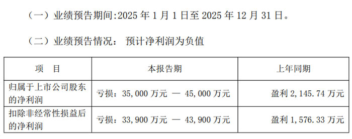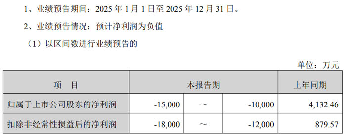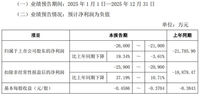 業(yè)績預告數(shù)據(jù)顯示,2025 年 1 月 1 日至 12 月 31 日期間,公司歸屬于上市公司股東的凈利潤預計虧損 19,000 萬元至 24,000 萬元,上年同期該數(shù)據(jù)為盈利 6,748.36 萬元;扣除非經(jīng)常性損益后的凈利潤預計虧損 20,000 萬元至 25,000 萬元,上年同期盈利 5,596.67 萬元;基本每股收益預計為 - 0.5328 元 / 股至 - 0.6730 元 / 股,上年同期為 0.1892 元 / 股。