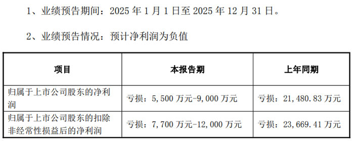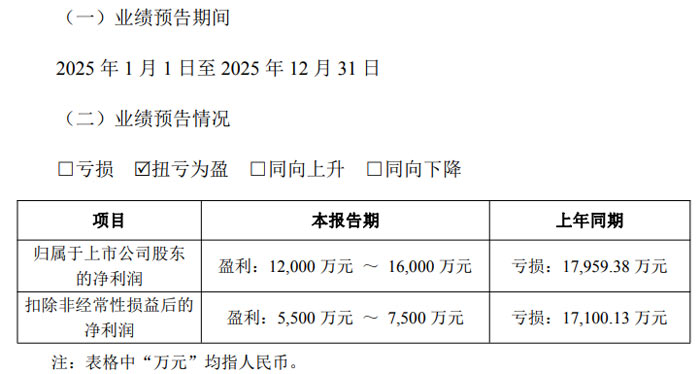從具體財務數(shù)據(jù)來看,扣除非經(jīng)常性損益后的凈利潤方面,公司 2025 年預計虧損 1300 萬元–2600 萬元,較上年同期的虧損 3715.56 萬元有所收窄。本次業(yè)績預告相關財務數(shù)據(jù)均為公司財務部門初步測算結果,未經(jīng)注冊會計師審計,公司已就業(yè)績預告有關事項與會計師事務所進行初步溝通,雙方不存在分歧。