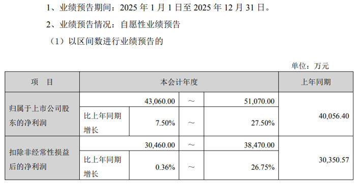 扣除非經(jīng)常性損益后,公司 2025 年度歸屬于上市公司股東的凈利潤預計為 15,500 萬元至 18,000 萬元,較上年同期的 11,400.09 萬元增加 4,100 萬元至 6,600 萬元,同比增長 36% 至 58%。據(jù)悉,上年同期公司每股收益為 0.174 元。