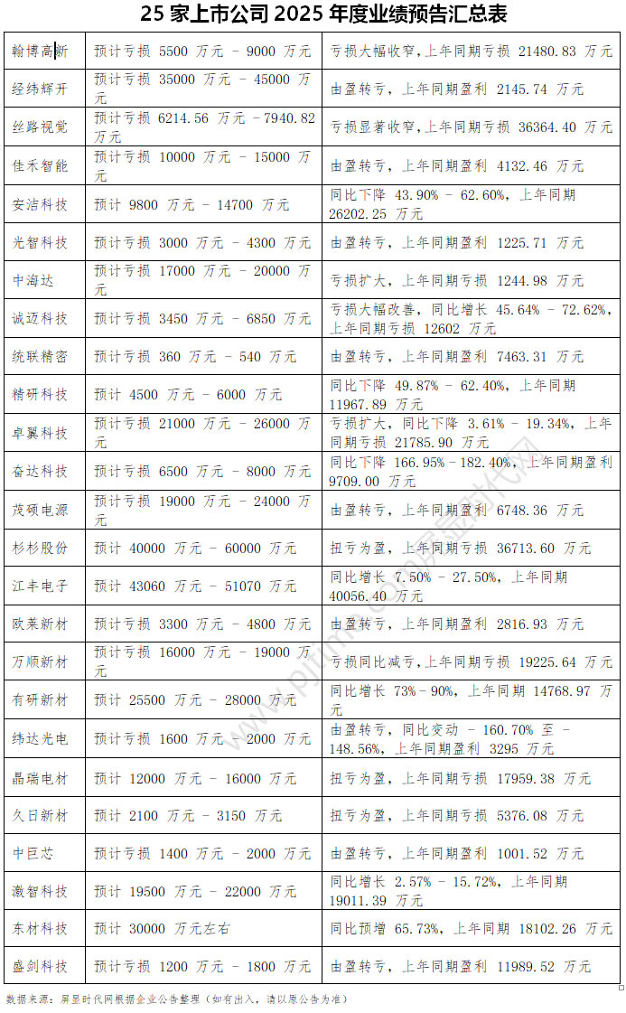 近日,翰博高新、杉杉股份、佳禾智能、經(jīng)緯輝開、安潔科技、萬順新材、晶瑞電材、久日新材、奮達科技、江豐電子、精研科技、誠邁科技等 25 家覆蓋觸控顯示、半導體材料、智能硬件等領域的科技制造企業(yè)集中披露 2025 年度業(yè)績。這份年度答卷清晰勾勒出行業(yè)發(fā)展現(xiàn)狀:受行業(yè)周期波動、市場環(huán)境變遷及企業(yè)經(jīng)營布局差異影響,25 家企業(yè)業(yè)績呈現(xiàn)顯著分化態(tài)勢,盈利與虧損陣營對比鮮明,既凸顯優(yōu)質(zhì)企業(yè)的經(jīng)營韌性,也折射出行業(yè)當前機遇與挑戰(zhàn)并存的發(fā)展格局。
