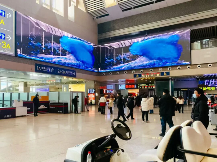 當您穿過大廳,來到檢票口。這里是登車的必經(jīng)之地,也是人流最密集之處。沈陽站部署了兩組洲明的巨型LED直角屏。細膩的色彩流轉(zhuǎn),既能清晰展示公共導引信息,又能放映品牌廣告或3D數(shù)字內(nèi)容,營造活潑溫潤的氛圍,消解了排隊時的枯燥感。