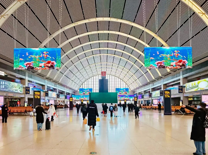 當你拖著行李走進煥新后的沈陽站候車大廳,抬頭便會邂逅一份驚喜——4塊洲明Uslim S2雙面屏懸立空中,宛如藝術(shù)裝置。