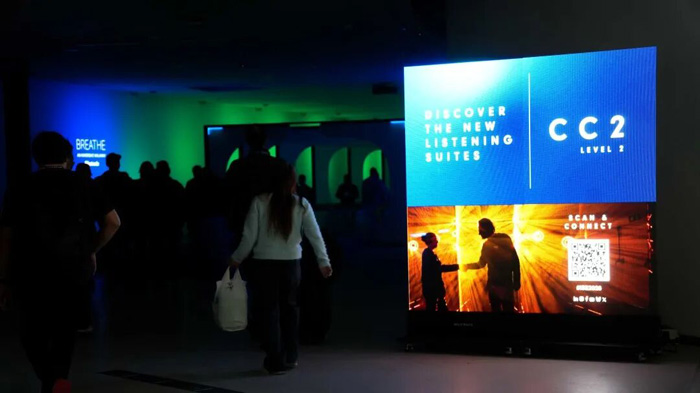 展會(huì)現(xiàn)場(chǎng),20臺(tái)美矽微LED隱形廣告機(jī)分布在展館多個(gè)通道節(jié)點(diǎn),不僅承擔(dān)信息指引功能,更讓透明顯示自然融入觀眾的行進(jìn)路徑。美矽微LED隱形廣告機(jī)采用三邊無(wú)框設(shè)計(jì),左右輕松拼接,支持快速搭建大尺寸透明顯示場(chǎng)景。是品牌活動(dòng)、展覽展示、零售終端、商業(yè)傳媒的最佳移動(dòng)式透明顯示解決方案。