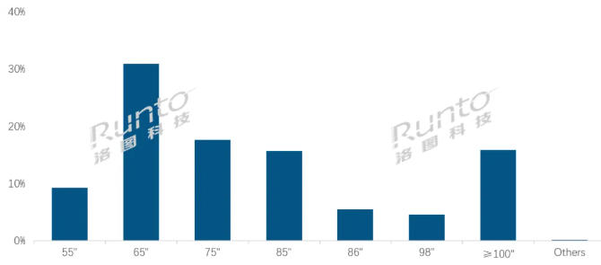 特別需要注意的是100英寸以上的超大尺寸占據(jù)了高達(dá)15.9%的市場(chǎng)份額,若是和98英寸合并,泛百寸大屏的占比則提升至20.6%。