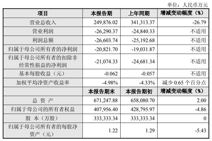 財(cái)報(bào)數(shù)據(jù)顯示,2025 年公司實(shí)現(xiàn)營(yíng)業(yè)總收入 249,876.02 萬(wàn)元,較上年同期的 341,313.37 萬(wàn)元同比下降 26.79%;營(yíng)業(yè)利潤(rùn)為 - 26,290.37 萬(wàn)元,利潤(rùn)總額為 - 26,603.74 萬(wàn)元,歸屬于母公司所有者的凈利潤(rùn)為 - 20,821.70 萬(wàn)元,較上年同期的 - 19,031.87 萬(wàn)元下降 9.40%;歸屬于母公司所有者的扣除非經(jīng)常性損益的凈利潤(rùn)為 - 21,074.33 萬(wàn)元,較上年同期的 - 24,681.34 萬(wàn)元改善 14.61%;久抗墒找鏋 - 0.062 元,加權(quán)平均凈資產(chǎn)收益率為 - 4.98%,較上年同期減少 0.65 個(gè)百分點(diǎn)。