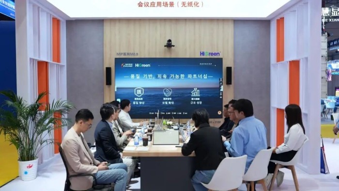 針對高端會(huì)議室對“遠(yuǎn)程協(xié)作”的嚴(yán)苛需求,HiGreen海格睿展示MIP系列M0.9LED顯示屏 + 智能陣列麥克風(fēng) + 分布式音頻處理器的深度融合方案。