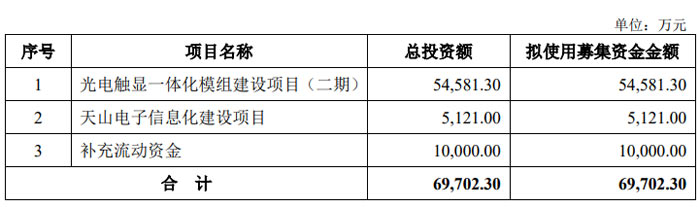 本次募集資金凈額將全部投入三大項目,光電觸顯一體化模組建設項目(二期):總投資額 54,581.30 萬元,擬全額使用募集資金投入,項目將引進先進生產(chǎn)設備和技術,優(yōu)化生產(chǎn)流程,提升中大尺寸彩色液晶顯示模組及復雜模組的生產(chǎn)能力與柔性制造水平,滿足下游客戶定制化需求。