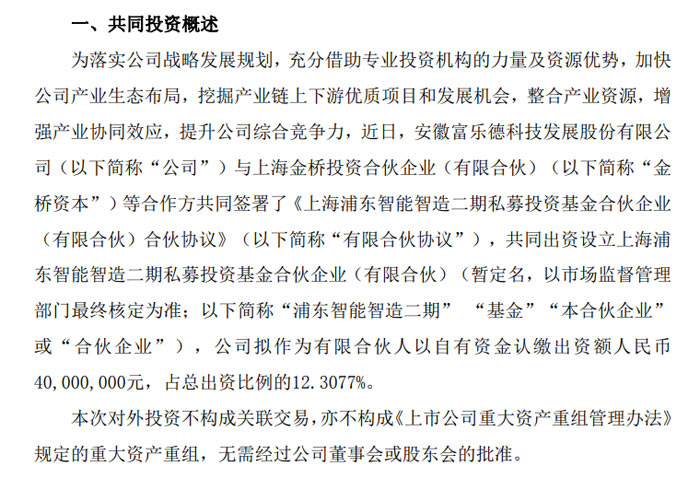 近日,安徽富樂德科技發(fā)展股份有限公司(證券代碼:301297,證券簡稱:富樂德)發(fā)布公告稱,公司與上海金橋投資合伙企業(yè)(有限合伙)等合作方共同簽署合伙協(xié)議,擬出資設立上海浦東智能智造二期私募投資基金合伙企業(yè)(有限合伙,暫定名),進一步完善公司產(chǎn)業(yè)生態(tài)布局,挖掘產(chǎn)業(yè)鏈上下游優(yōu)質(zhì)發(fā)展機會。