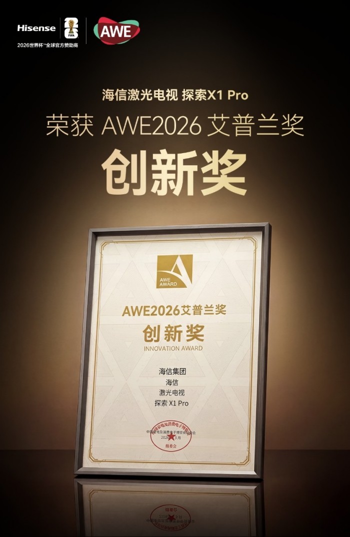 近日,在2026年中國(guó)家電及消費(fèi)電子博覽會(huì)(AWE 2026)上,海信激光電視旗艦新品100吋探索X1 Pro重磅亮相,并成功斬獲有“中國(guó)消費(fèi)電子創(chuàng)新風(fēng)向標(biāo)”之稱的艾普蘭創(chuàng)新獎(jiǎng)。這也是繼探索X1 Ultra摘得2025年艾普蘭獎(jiǎng)后,該系列再度加冕。