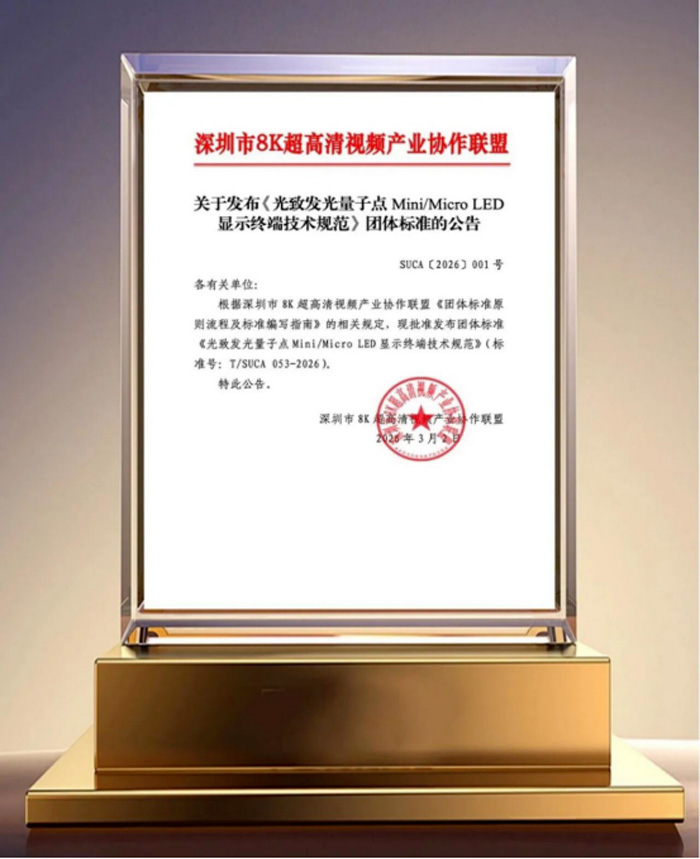 近日,由深圳市8K超高清視頻產(chǎn)業(yè)協(xié)作聯(lián)盟歸口,利亞德、賽富樂斯、電子標(biāo)準(zhǔn)院等多家行業(yè)領(lǐng)軍企業(yè)與科研機(jī)構(gòu)共同制定的《光致發(fā)光量子點(diǎn)Mini/Micro LED顯示終端技術(shù)規(guī)范》(T/SUCA 053-2026)團(tuán)體標(biāo)準(zhǔn)正式發(fā)布,填補(bǔ)了全球光致發(fā)光量子點(diǎn)與Mini/MicroLED原位集成顯示領(lǐng)域的標(biāo)準(zhǔn)空白。