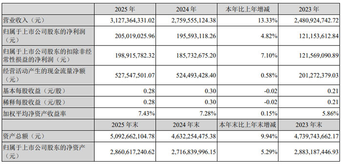聚燦光電科技股份有限公司(股票簡稱:聚燦光電,股票代碼:300708)2025 年年度報告顯示,公司全年實現(xiàn)營業(yè)收入 31.27 億元,同比增長 13.33%;歸母凈利潤 2.05 億元,同比增長 4.82%;扣非凈利潤 1.99 億元,同比增長 7.10%,三大核心財務(wù)指標(biāo)均創(chuàng)同期歷史新高,經(jīng)營業(yè)績穩(wěn)健增長。
