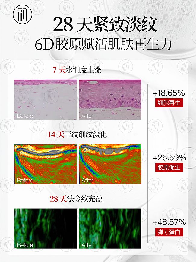 雙鏈路激活,膠原自給自足------專利玻色因+水解膠原,不僅直補更能促生。數(shù)據(jù)顯示,28天后細胞再生率提升18.65%,促生膠原提升25.59%,彈力蛋白提升48.57%,實現(xiàn)外力補充+內(nèi)力激活的雙重保障。