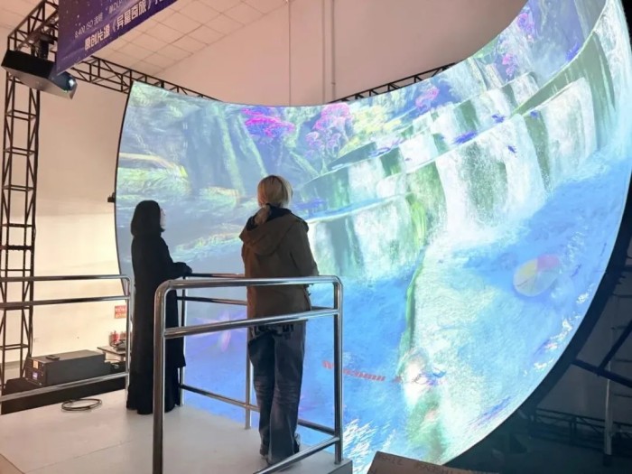 這里涵蓋了諸多文化旅游產(chǎn)業(yè)領(lǐng)域的潮流應(yīng)用,有動(dòng)感球幕影院、飛行影院、建筑投影秀、《仙府傳說》原創(chuàng)IP光影秀、沉浸式互動(dòng)空間、3D/2D同屏顯示系統(tǒng)、L型沉浸式虛擬現(xiàn)實(shí)協(xié)同工作系統(tǒng)、兩面緊湊型CAVE、新一代飛行模擬器、透明顯示、LED新一代技術(shù)和應(yīng)用演示等。