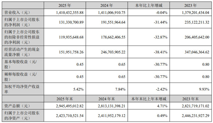 2026 年 3 月,濮陽惠成電子材料股份有限公司(股票簡稱:濮陽惠成,股票代碼:300481)發(fā)布 2025 年年度報告。報告顯示,公司全年實現(xiàn)營業(yè)收入 14.10 億元,較上年微降 0.04%;歸屬于上市公司股東的凈利潤 1.31 億元,歸屬于上市公司股東的扣除非經(jīng)常性損益的凈利潤 1.20 億元;基本每股收益 0.45 元。盡管面臨行業(yè)競爭加劇等挑戰(zhàn),公司憑借核心產(chǎn)品優(yōu)勢與技術(shù)創(chuàng)新實力,保持了經(jīng)營的穩(wěn)定性,同時在產(chǎn)能擴(kuò)張、市場拓展等方面取得積極進(jìn)展。