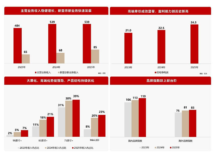 2025年,海信視像堅(jiān)定不移推進(jìn)“高端化、大屏化、智能化”戰(zhàn)略,主營(yíng)業(yè)務(wù)收入穩(wěn)健增長(zhǎng),第二曲線新顯示新業(yè)務(wù)表現(xiàn)亮眼。報(bào)告期內(nèi),新顯示新業(yè)務(wù)實(shí)現(xiàn)主營(yíng)業(yè)務(wù)收入84.58億元,同比增長(zhǎng)24.92%,成為公司重要增長(zhǎng)引擎。