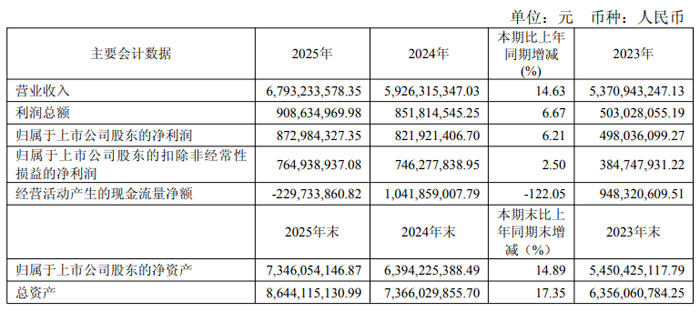 2025 年,晶晨股份實(shí)現(xiàn)營業(yè)收入 67.93 億元,同比增長 14.63%;歸屬于上市公司股東的凈利潤 8.73 億元,同比增長 6.21%;扣除非經(jīng)常性損益后的歸母凈利潤 7.65 億元,同比增長 2.50%。基本每股收益 2.08 元,同比增長 5.58%,加權(quán)平均凈資產(chǎn)收益率 12.66%。全年芯片銷量超 1.74 億顆,同比增加 0.31 億顆,產(chǎn)銷規(guī)模穩(wěn)步擴(kuò)大。