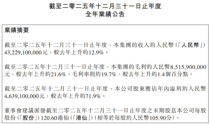 利潤分配上,董事會建議派發(fā) 2025 年末期股息每股 120.60 港仙(約合人民幣 1.06 元),派息率從 2024 年的 20% 提升至 25%,此次派息尚需股東大會批準,若獲通過將于 2026 年 6 月 26 日支付。