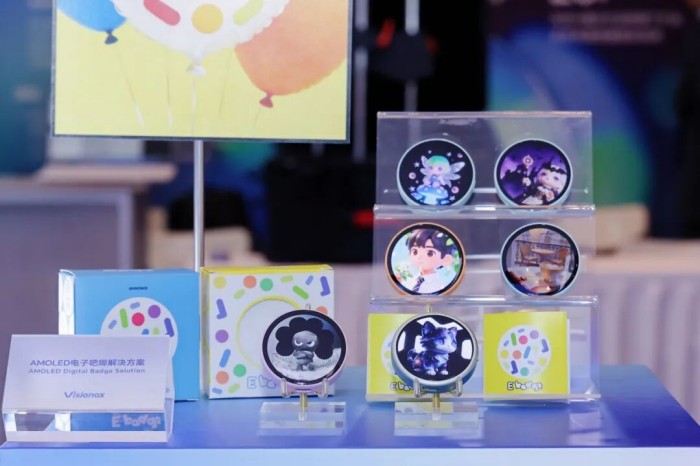 此次亮相的AMOLED電子吧唧,是維信諾面向“谷子經濟”推出的新型顯示應用。產品搭載1.75英寸AMOLED小圓屏,分辨率466×466,亮度700nits,色域130%,結合藍牙、NFC、觸控和AOD等能力,可實現(xiàn)個性化、社交、互動、裝飾四大核心功能。它不僅可以用于圖片、動圖、小視頻展示,還可應用于IP周邊、追星應援、動態(tài)入場憑證等場景。