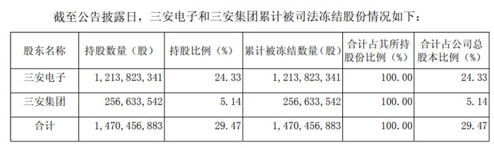 3月30日,三安光電股份有限公司發(fā)布《關(guān)于控股股東股份被司法凍結(jié)、輪候凍結(jié)的公告》稱,公司于2026年3月28日收到間接控股股東福建三安集團(tuán)有限公司(以下簡稱“三安集團(tuán)”)通知,三安集團(tuán)和控股股東廈門三安電子有限公司(以下簡稱“三安電子”)所持公司股份被司法凍結(jié)、輪候凍結(jié)。其中,三安電子凍結(jié)股份數(shù)量為1,213,823,341股,三安集團(tuán)凍結(jié)股份數(shù)量為256,633,542股,共計(jì)1,470,456,883股,截至公告披露日,合計(jì)占公司總股本比例29.47%。