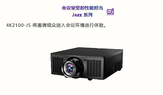 展會現(xiàn)場,Jazz 4K2100‑JS將搭建實景會議體驗區(qū),邀請觀眾身臨其境感受高效會議顯示體驗。該機(jī)型擁有21350流明高亮輸出,機(jī)身重量小于30kg,安裝靈活、調(diào)試便捷;搭載0.8英寸HEP DMD芯片與原生4K分辨率,文字清晰、畫面銳利、色彩準(zhǔn)確,可完美適配視頻會議、演示匯報、多媒體播放、小型演出等多種需求。從企業(yè)會議室、學(xué)校報告廳,到博物館臨時展區(qū)、主題公園小型劇場,Jazz系列以穩(wěn)定可靠、全場景適配的特性,成為專業(yè)視聽集成的“性能擔(dān)當(dāng)”。