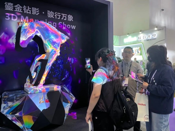 流動的光影在展館明亮環(huán)境下依舊呈現(xiàn)飽和、細膩的質(zhì)感,馬匹鬃毛與紋路光澤栩栩如生,盡顯視美樂異形投影硬實力。