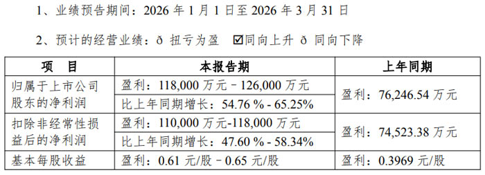 根據(jù)業(yè)績預(yù)告,滬電股份 2026 年第一季度歸屬于上市公司股東的凈利潤預(yù)計為11.80 億元–12.60 億元,上年同期為盈利 7.62 億元,同比增長 54.76% - 65.25%;扣除非經(jīng)常性損益后的凈利潤預(yù)計為11.00 億元–11.80 億元,上年同期為盈利 7.45 億元,同比增長 47.60% - 58.34%。基本每股收益預(yù)計為 0.61 元 / 股–0.65 元 / 股,上年同期為 0.40 元 / 股。