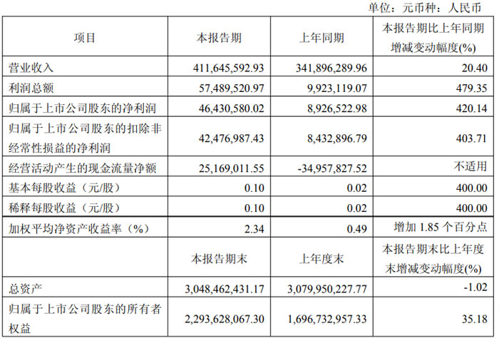 歸屬于上市公司股東的凈利潤 4643.06 萬元,較上年同期 892.65 萬元增長 420.14%;歸屬于上市公司股東的扣除非經(jīng)常性損益的凈利潤 4247.70 萬元,較上年同期 843.29 萬元增長 403.71%。
