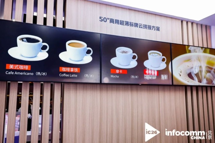 飛利浦則圍繞咖啡店等場景打造高品質場景體驗。展出的50英寸商用超薄標牌、高對比度防眩光的吧臺屏,以及支持橫豎屏自由切換、4K長時間流暢運行的86寸商用房價牌都讓人眼前一亮。