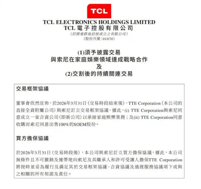 3月31日,TCL電子發(fā)布公告,其全資子公司TTE Corporation與索尼達(dá)成交易框架:雙方成立合資公司承接索尼全球家庭娛樂業(yè)務(wù),TCL持股51%實(shí)現(xiàn)控股,索尼保留49%股權(quán);同時(shí)TCL全資收購(gòu)索尼馬來西亞制造子公司SOEM 100%股權(quán),交易總對(duì)價(jià)753.99億日元(約37.81億港元),預(yù)計(jì)2027年4月完成交割。這是近二十年來全球電視行業(yè)最具標(biāo)志性的并購(gòu)案,意味著中國(guó)企業(yè)首次掌控日系高端電視品牌的運(yùn)營(yíng)主導(dǎo)權(quán)。