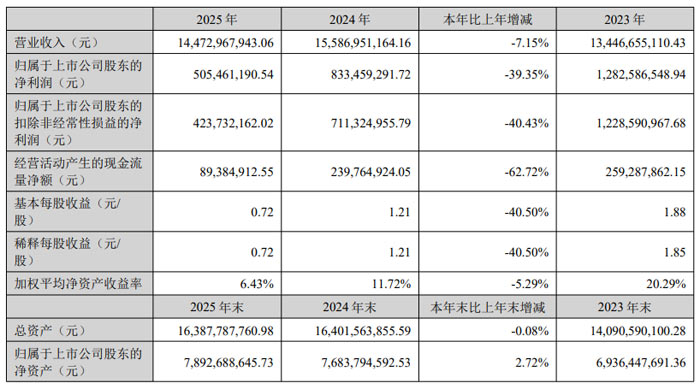 2025 年,康冠科技整體經(jīng)營保持韌性,全年實(shí)現(xiàn)營業(yè)收入144.73 億元,同比下降7.15%;歸屬于上市公司股東的凈利潤5.05 億元,同比下降39.35%;扣除非經(jīng)常性損益后的凈利潤4.24 億元,同比下降40.43%。業(yè)績下滑主要系報(bào)告期計(jì)提3.47 億元應(yīng)收賬款信用減值損失所致,剔除該因素后公司主營業(yè)務(wù)盈利能力保持穩(wěn)定。