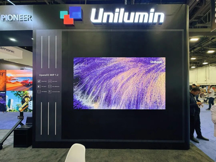 展臺前方陳列的,是業(yè)界領(lǐng)先的弧形MIP屏——洲明UHF。產(chǎn)品具備MIP產(chǎn)品所有優(yōu)勢,同時(shí)支持弧形等創(chuàng)意安裝,更具靈活性。