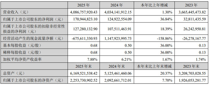 截至 2025 年末,公司總資產(chǎn)達(dá)61.70 億元,較上年末增長(zhǎng)20.37%;歸屬于上市公司股東的凈資產(chǎn)22.54 億元,較上年末增長(zhǎng)7.70%,資產(chǎn)規(guī)模持續(xù)擴(kuò)大,財(cái)務(wù)狀況穩(wěn)健。