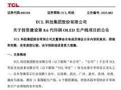 9 月 12 日晚間,TCL 科技集團(tuán)股份有限公司(證券代碼:000100,簡(jiǎn)稱 “TCL 科技”)發(fā)布公告,宣布其子公司 TCL 華星光電技術(shù)有限公司(簡(jiǎn)稱 “TCL 華星”)將與廣州市人民政府、廣州經(jīng)濟(jì)技術(shù)開(kāi)發(fā)區(qū)管理委員會(huì)攜手,在廣州投建第 8.6 代印刷 OLED 顯示面板生產(chǎn)線…詳情>>