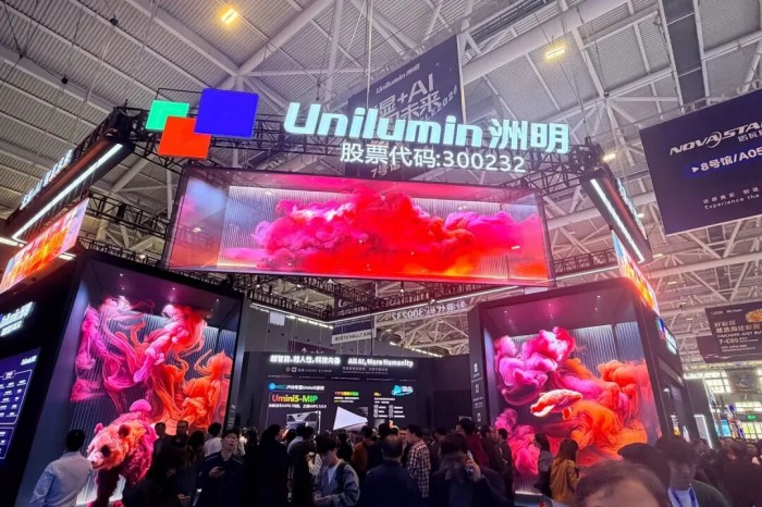ISLE洲明光顯+AI沉浸式視聽在人潮涌動的7號館A01展位,洲明科技攜全球超薄COB廣告機、全球首款MIP全息屏等創(chuàng)新產(chǎn)品,以及AI智