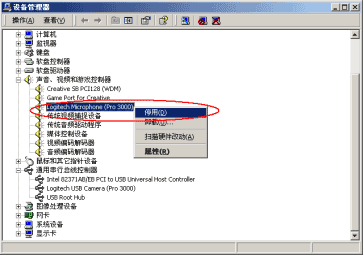 例如,您安裝的攝像頭是Logitech USB Camera (Pro 4000)。將在"聲音、視頻和游戲控制器"下出現(xiàn)它的聲音采集裝置"Logitech Microphone (Pro 4000)/USB Audio device",這就是需要被禁用的設(shè)備。