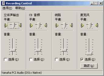 在"調(diào)節(jié)音量"框中選中"錄音"(注意,"混音器"一欄一定要選擇正確的語音輸入設(shè)備,如果Logitech攝像頭的麥克風(fēng)沒禁用的話,可能會(huì)出現(xiàn)在這里)。在"顯示下列音量控制"列表中,一定要保證選中了"麥克風(fēng)",否則不能輸入聲音(當(dāng)然有些可能也是用的線路輸入,這時(shí)就要選"線路"輸入了)。單擊"確定"按鈕,回到"錄音控制"窗口,如下圖: