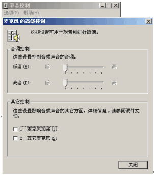 將"麥克風(fēng)"的"選擇"框選中,并單擊"麥克風(fēng)"的"高級(jí)",彈出"麥克風(fēng)的高級(jí)控制"窗口,為了避免對(duì)方聽見吵雜的聲音,取消選擇"其它控制"的設(shè)置,單擊"關(guān)閉"完成設(shè)置。如下圖: