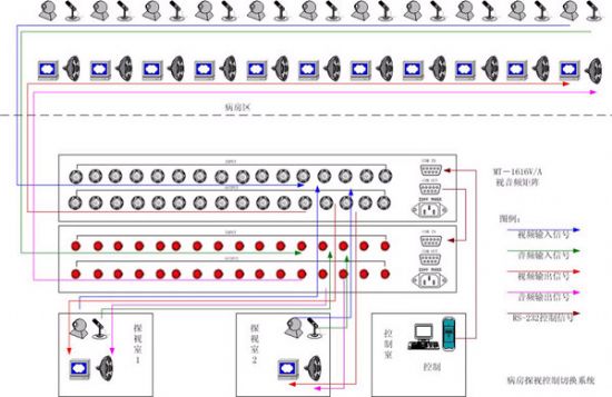 (2) 在1~12號病床和1、2號探視室共14個(gè)點(diǎn)每個(gè)點(diǎn)都安裝視音頻輸入輸出設(shè)備,視頻輸入:攝像頭;音頻輸入:麥克風(fēng)(需加信號放大器);視頻輸出:監(jiān)視器;音頻輸出:揚(yáng)聲器(需加信號放大器)