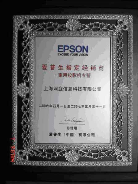 2006年3月,愛普生在成都希爾頓酒店舉辦全國經(jīng)銷商大會,網(wǎng)庭公司喜獲“最佳銷售獎”,并取得兩項代理證書,分別為“愛普生指定經(jīng)銷商--投影機專營”和“愛普生指定經(jīng)銷商--家用投影機專營”。